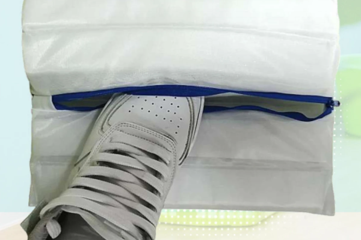 Bolsa ideal para lavar zapatos en tela dentro de la lavadora. Sus columnas de espuma evitan fuertes golpes de la máquina.